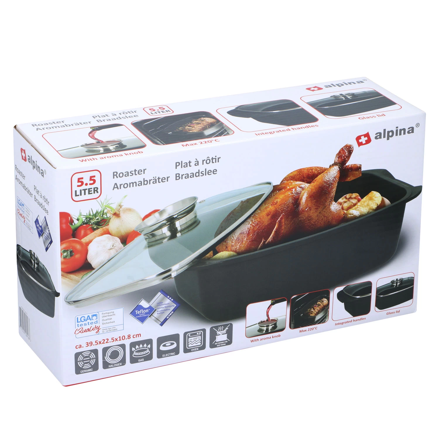 Braad de meest heerlijke gerechten in deze Alpina braadslede van gegoten aluminium. De braadslede is geschikt voor veel verschillende warmtebronnen behalve inductie. Gebruik de braadslede om gerechten vetarm te koken of smoren. De braadslede heeft een duurzame anti-aanbaklaag van Teflon-kwaliteit en wordt geleverd met een hittebestendig deksel. Het deksel heeft een aromaknop waardoor je vloeistoffen zoals wijn of bouillon druppelsgewijs kunt toevoegen. De braadpan heeft een afmeting (zonder deksel) van ca. 39,5 x 22,5 x 10,8 cm en met deksel ca. 40 x 22,5 x 15,5 cm.