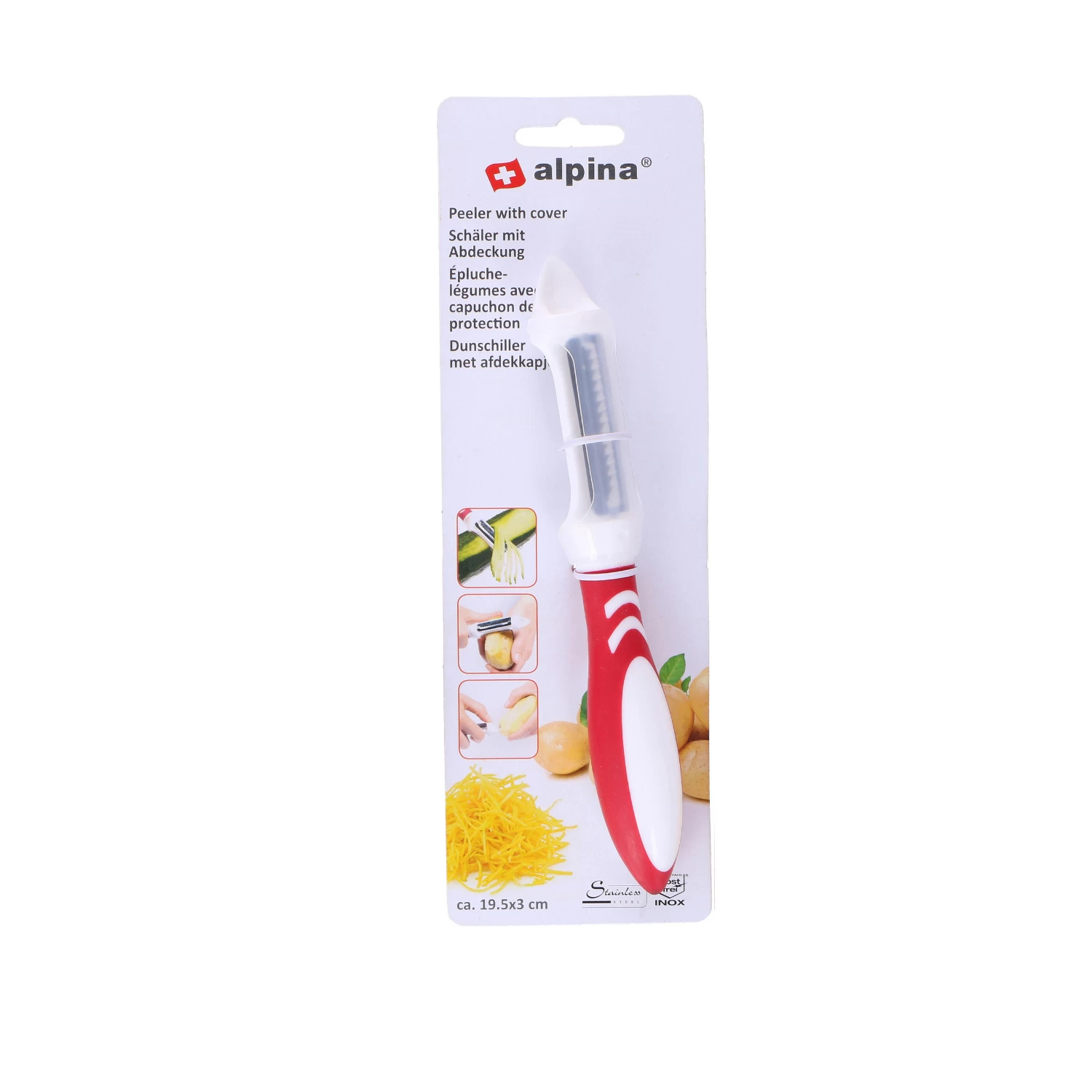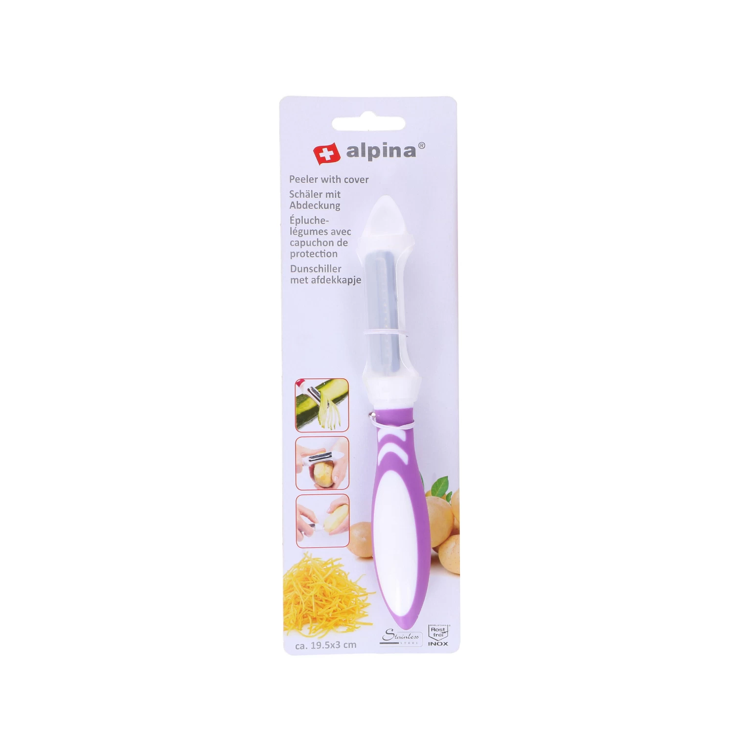 Deze dunschiller van Alpina is onmisbaar in de keukenlade. De praktische dunschiller heeft 3 functies, met het ene mes kun je normaal recht schillen, het andere dient als een julienneschiller en met de bovenkant van de dunschiller kun je aardappelogen verwijderen. Het keukenhulpje is er in verschillende kleuren, het is niet vooraf te bepalen welke je ontvangt.