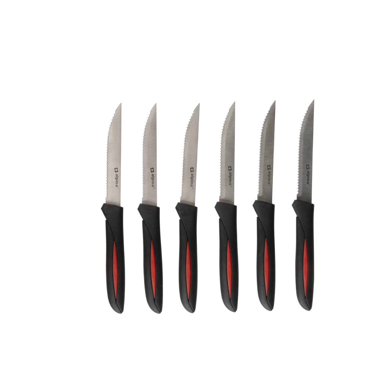 Een set van 6 hoogwaardige Alpina RVS steakmessen van 22,8 cm. Messen zijn gemaakt van hoge Zwitserse kwaliteit. Bovendien is het strakke design een aanwinst voor elke keuken.