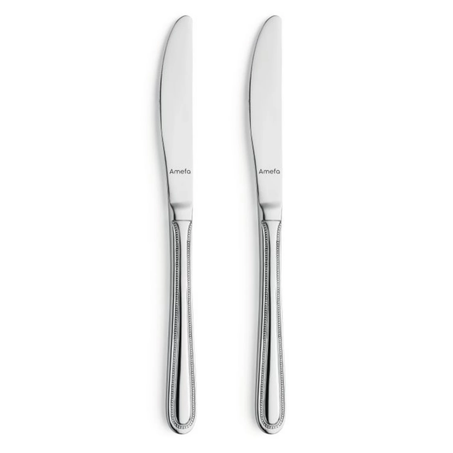Amefa Pearl is een klassiek model. Het ontwerp heeft rondom het heft een decoratieve rand welke een rij parels vertegenwoordigd zoals dat in de 18e eeuw gebruikelijk was. De 2-delige set Amefa tafelmessen heeft 2 messen van 22 cm lang. De messen hebben een hoogglans afwerking en zijn vaatwasmachinebestendig.