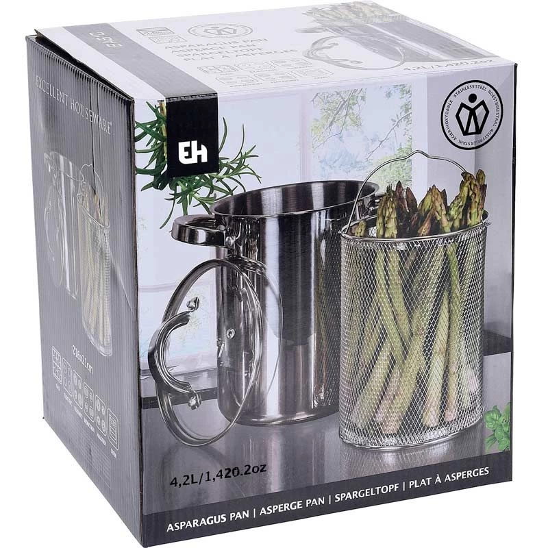 - Afmetingen: De Aspergepan heeft een diameter van 16 cm en een hoogte van 21 cm, waardoor hij ideaal is voor het bereiden van zowel witte als groene asperges.