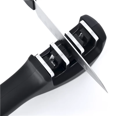Met deze Berghoff messenslijper zijn botte messen geen probleem meer! Trek je messen door deze slijper, en de 3 stappen waar hij doorheen gehaald wordt zullen het mes weer zo goed als nieuw maken. Het diamanten oppervlak bereidt de messen voor, het wolfraamstaal vormt de snijkant tot een V-vorm, en de keramische steen polijst het lemmet en verwijdert alle oneffenheden. Het handvat ligt stabiel in de hand en heeft een antislip-patroon voor extra veiligheid!