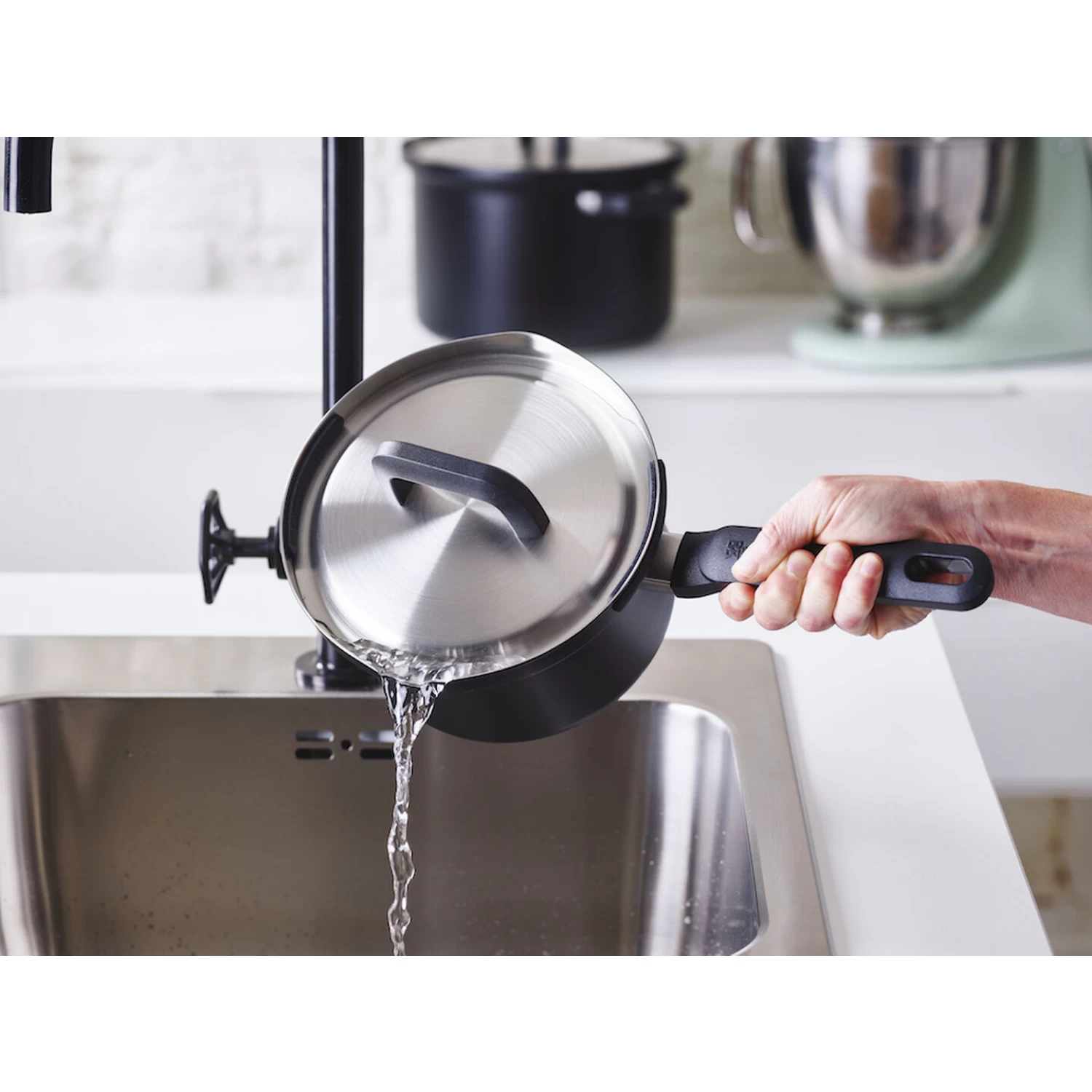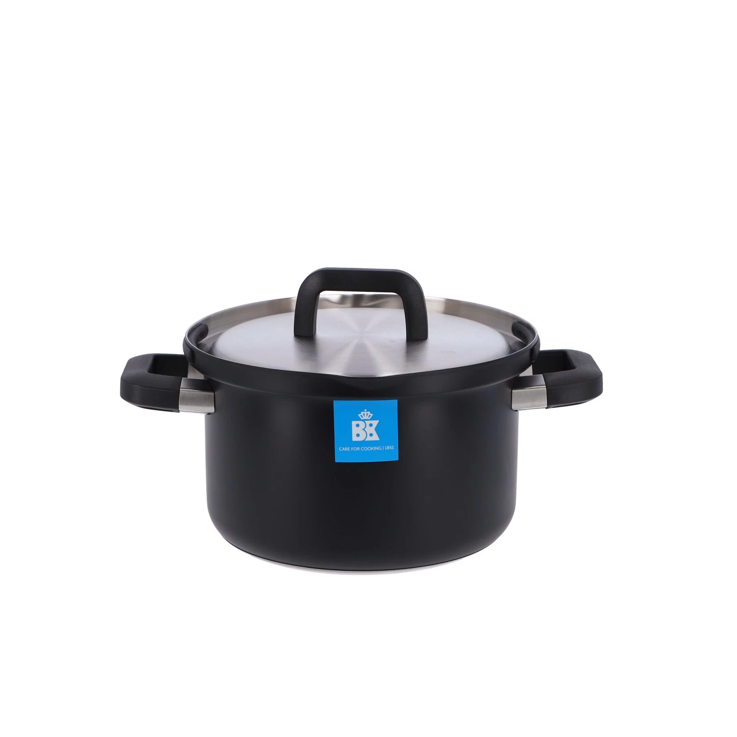 Een stoere zwarte rvs pannenset van BK. De BK Flow Cool Black RVS pannenset is vier delig en bestaat uit 3 kookpannen met dekselΒ en een steelpan met deksel. De BK Flow Cool Black kookpannen zijn voorzien van een veilig en uniek afgietsysteem. Met een simpele kwartslag draai, vergrendeld deΒ deksel onder de zwarte siliconen stoppers. Zo kun je op een veilige manier met twee handen afgieten.Β