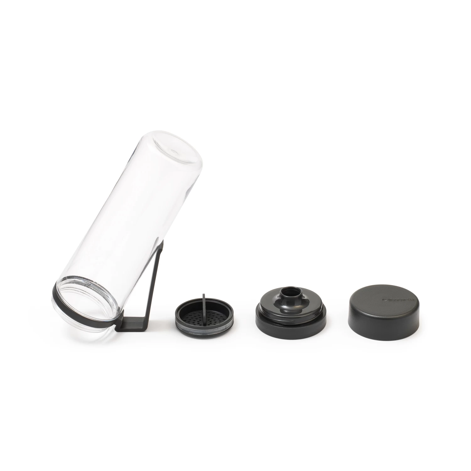 Geniet onderweg van je water met een smaakje, of máák het onderweg, met deze Brabantia Make & Take waterfles met zeef. Het fruit dat je erin doet, blijft in de fles dankzij de slimme zeef onder de tuit. Dorst gelest? Doe de lekvrije dop er weer op en hang hem aan het oor, ook een handige steun om je fles schuin te zetten zodat hij beter droogt na het afwassen. Handig, hygiënisch en herbruikbaar, dus gezond voor jou en de planeet!