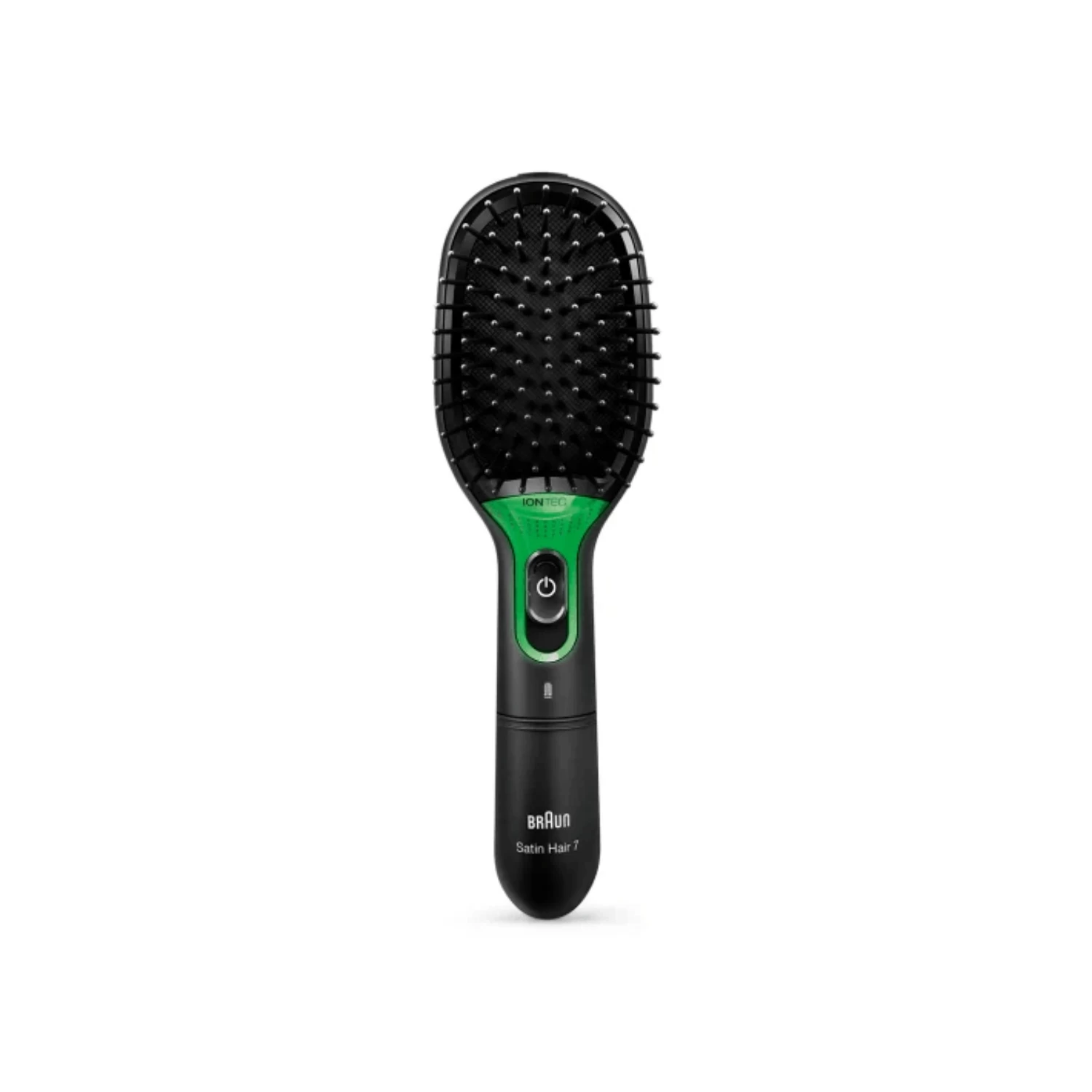 Nooit meer haar uit model dankzij de eerste borstel ter wereld met IONTEC. Deze laat miljoenen actieve ionen vrij die elke haarstreng omhullen tegen pluizig en statisch haar en voor een zichtbare superglans. – De eerste ionische borstel ter wereld met actieve ionen die je vanaf het eerste gebruik zichtbaar meer glans geeft, in vergelijking met de Satin Hair Brush zonder IONTEC. – De naadloze borsteltechnologie zorgt voor exceptioneel zacht borstelen zonder de haarwortel te beschadigen – Verwijderbaar kussen voor een gemakkelijke reiniging – Werkt op batterijen, bevat 2 batterijen – Gaat automatisch uit voor langere levensduur – Niet van toepassing