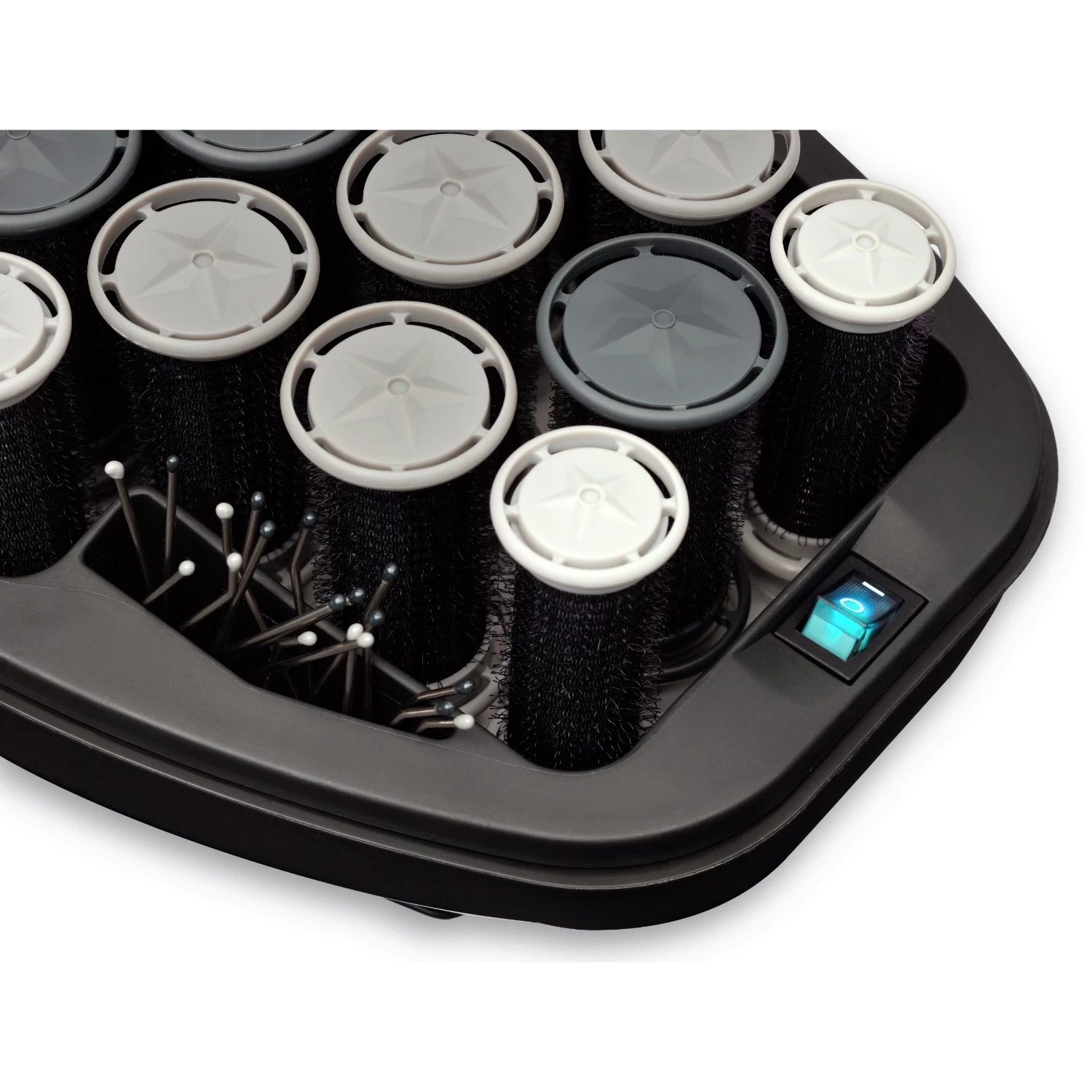 De Carmen Pro Roller set (C5040), ook wel bekend als de Carmenset, is makkelijk in gebruik en perfect geschikt voor het creëren van volume en krullen van verschillende soorten. Van groffe natuurlijke krullen tot een weelderige haardos met kleine krullen, met deze set kan het allemaal. De rollers hebben een klittenband bekleding, waardoor de rollers mooi op hun plek blijven zitten. Met de ‘klaar voor gebruik’ indicatie is het makkelijk te zien als de rollers volledig warm zijn. Gelukkig hebben ze maar 5 minuten nodig om op te warmen. Na gebruik berg je de set gemakkelijk op. Deze krulset bestaat uit acht grote (27 mm), acht medium (23 mm) en acht kleine (20 mm) met klittenband beklede rollers. Inclusief vlinderklemmen en clips in verschillende maten en kleuren.