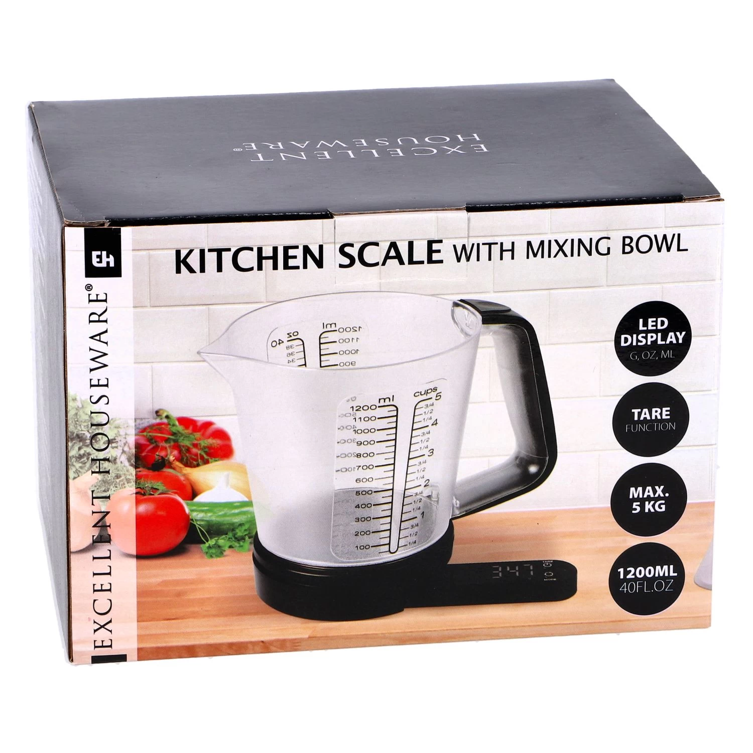 Deze set van keukenweegschaal met mengkom in 1 is onmisbaar in de keuken! De mengkom van Excellent Houseware heeft maataanduidingen van cups, ml en oz. Er past tot 1200 ml inhoud in de mengkom. De weegschaal heeft een LED display die je gemakkelijk weer onder de mengkom kunt schuiven. Werkt op 2 AAA-batterijen, deze worden niet meegeleverd.