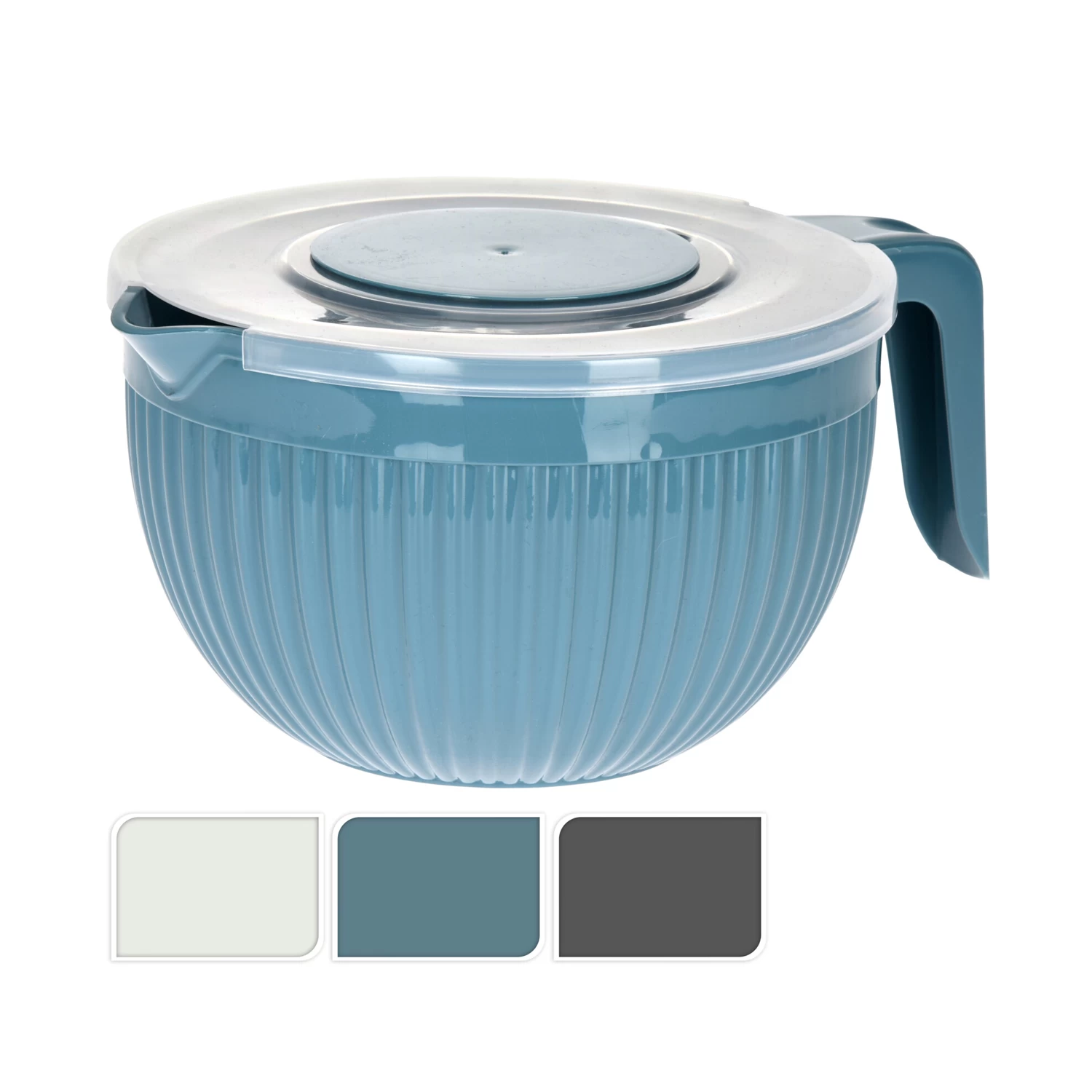 Deze mengkom met deksel en schenktuit van Alpina is ideaal voor bij het opkloppen van biscuitdeeg, crèmes, slagroom of icing. Het tweedelige dekselsysteem maakt het veel makkelijker om te roeren dan bij normale mengkommen. Bij het kloppen draai je alleen het middelste deel eraf, zodat er ruimte vrijkomt voor de garde, maar het deksel blijft aan de randen zitten zodat je keuken beschermd is tegen ongewenste spetters van opgeklopt voedsel. Om te voorkomen dat de opgeklopte lekkernijen uitdrogen kan het middengedeelte van het deksel afgedekt worden. Inhoud: 3,5 liter. Afmeting: Ø 22,5 cm x 14 cm. De mengkom is vaatwasmachinebestendig.