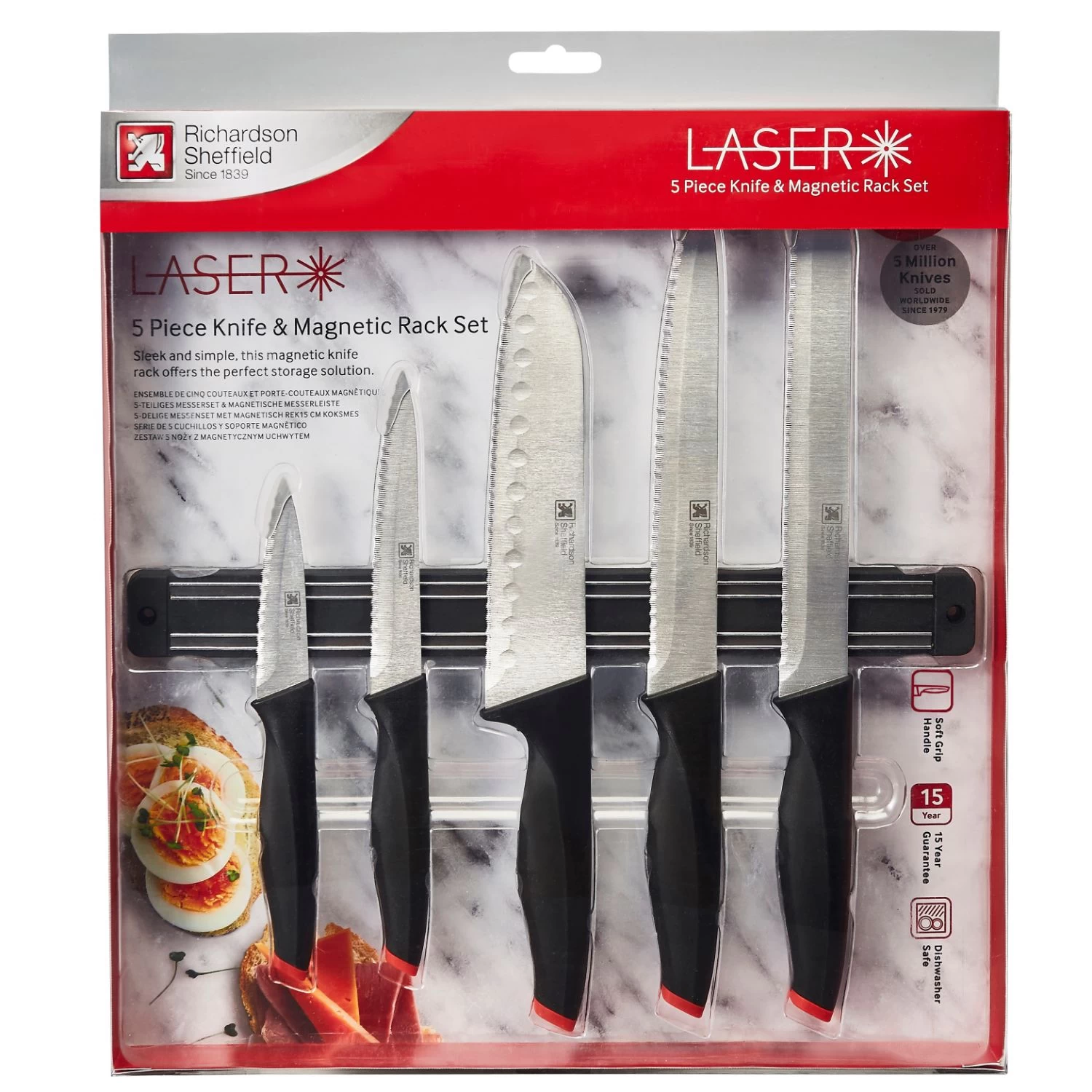 Deze mooie 5-delige Richardson Sheffield set bevat 5 messen met een magnetisch rek. Bevestig het rek aan de muur en hang er de messen op. Hierdoor bespaar je ruimte in de besteklade en heb je ze altijd bij de hand. De gekartelde messen hebben een hendel met soft grip en zijn geschikt voor in de vaatwasser.