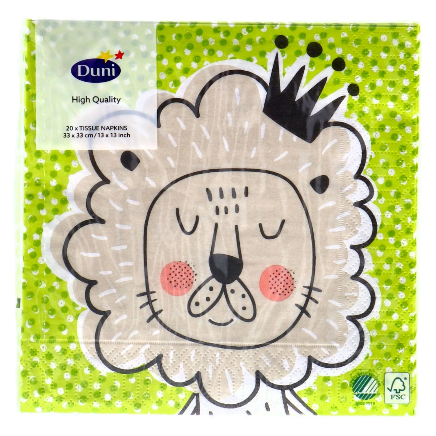 Servetten zijn een uitstekende manier om jouw eettafel net een beetje extra stijl mee te geven! Met deze Duni servetten, bedrukt met een speelse leeuwenkoning op groen papier, maak jij jouw gedekte tafel helemaal af! De servetten zijn gemaakt van 3-laags tissuepapier en hebben een formaat van 33cm. De verpakking bevat 20 servetten, zodat jij genoeg hebt voor iedereen!