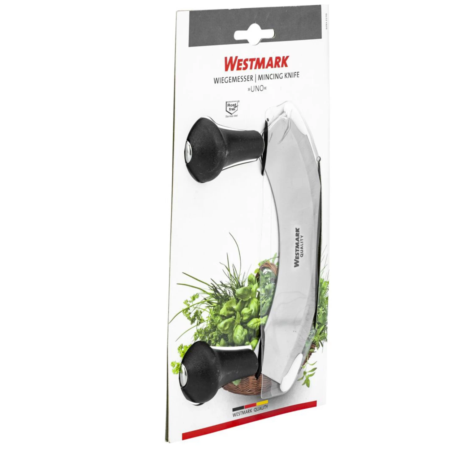 Het praktische Uno wiegemes van Westmark met enkelsnijdend lemmet is de ideale hulp bij het energiebesparend, snel hakken en snijden van verse kruiden, uien, knoflook, chocolade en dergelijke. Het voordeel hiervan is dat het snijgoed voorzichtig wordt versnipperd en niet wordt verpletterd tijdens het wiegen. Het roestvrijstalen lemmet glijdt moeiteloos en snel door de kruiden en de twee grote, antislip kogelgrepen zorgen voor de nodige grip om efficiënt te werken. Voor vers gesneden kruiden met een vol aroma!
